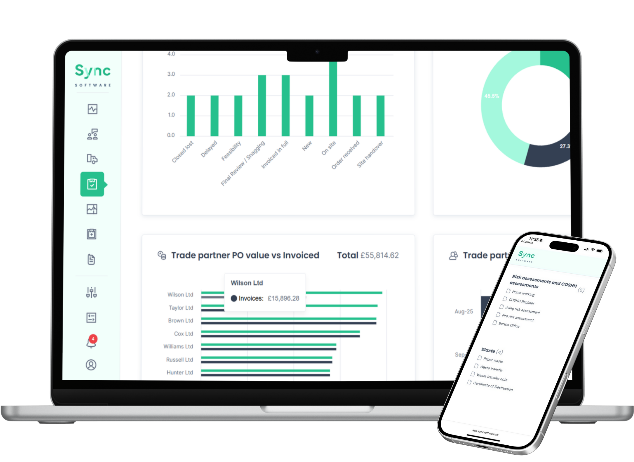 Sync provides live construction reporting that updates as work progresses. Track project performance, cost exposure, and compliance status without waiting for end-of-month spreadsheets.